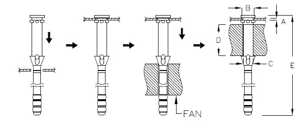 | NUMÉRO DE PIÈCE | MATÉRIAU | A CHÂSSIS ÉPAISSEUR | B TROU DANS CHÂSSIS | C TROU DANS VENTILATEUR | D CHÂSSIS DU VENTILATEUR ÉPAISSEUR | E | EMBALLAGE |