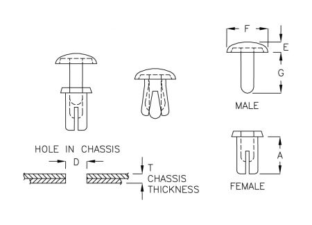 - 指で2つのリベットの頭部を押して簡単に取り付けることができ、女性部分は広がって固定されます。